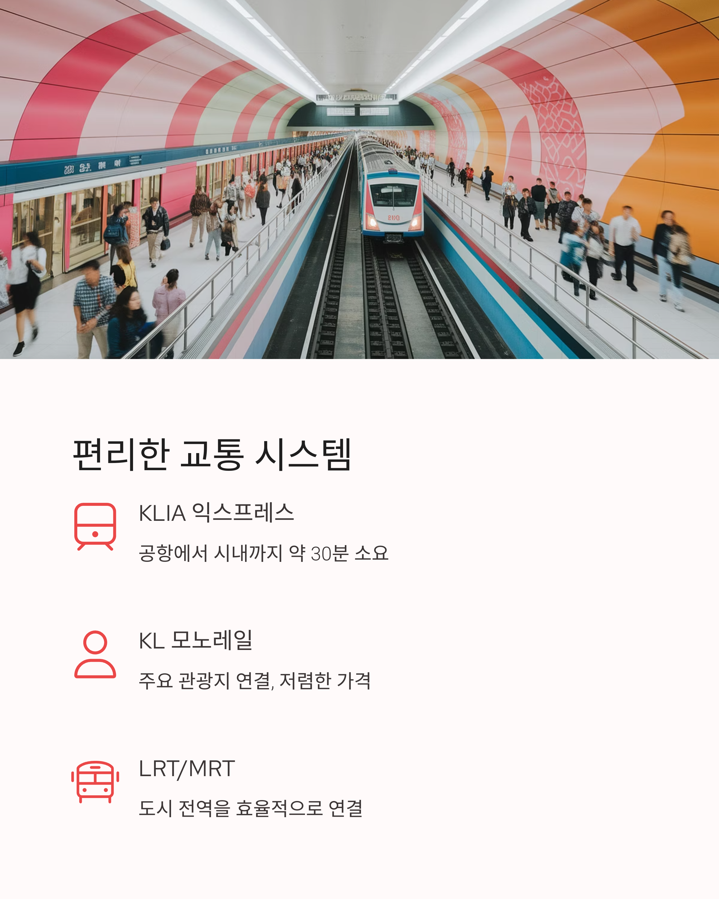 주요 대중교통 수단인 KL Monorail, LRT, MRT는 서로 유기적으로 연결되어 있어 이동이 매우 쉽습니다.