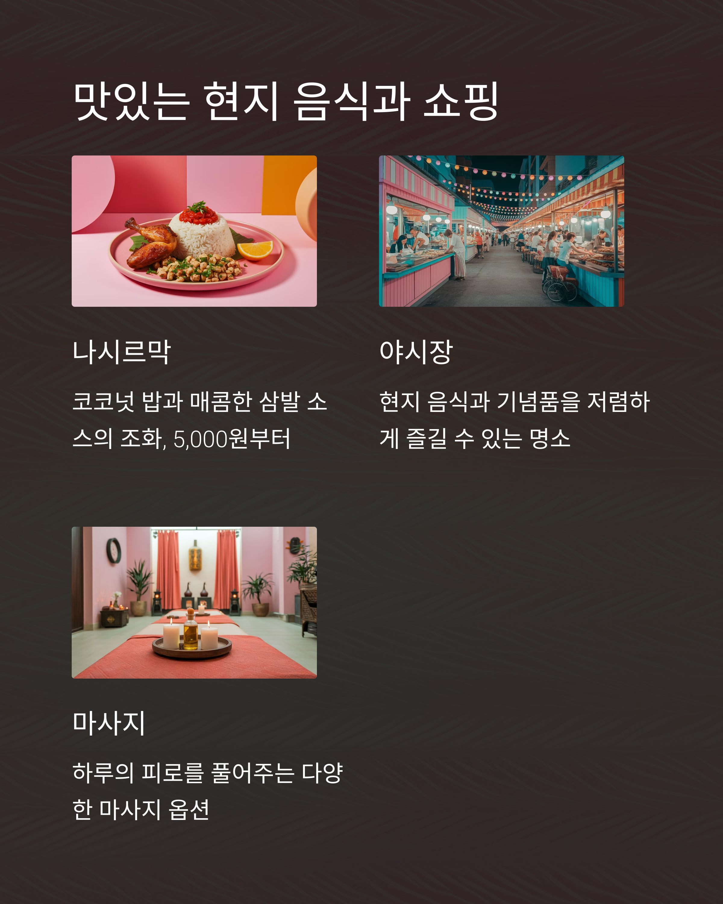 매력적인 야시장과 맛집을 마음껏 즐기며 현지 문화를 가까이에서 느낄 수 있습니다.